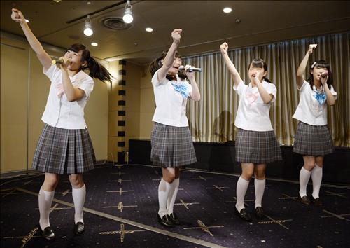 | △ 여성 아이돌 그룹 '제복향상위원회'가 28일 도쿄의 일본외국특파원협회에서 진행한 기자회견에서 공연하는 모습.(교도.연합뉴스) |