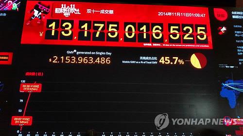 △ (항저우=연합뉴스) 중국 최대 전자상거래 업체인 알리바바가 2014년 11월11일 '독신자의 날'을 맞아 저장성 항저우에 있는 본사에서 할인행사를 개시했다. 사진은 초반 매출이 폭발적으로 증가하는 상황을 보여주는 전광판.