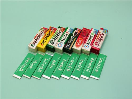 쥬시후레쉬·후라보노·자일리톨·커피·이브 등 8종의 장수 인기 제품 내포장지에 좋은 글을 담아 껌을 주고받을 때 힘과 용기를 주자는 취지로 캠페인을 기획했다고 롯데제과는 설명했다.