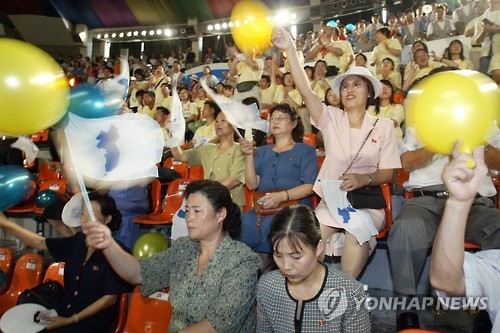 | △ 광복 60주년인 2005년 8월15일 서울 장충체육관에서 6.15공동선언실천을위한 남북해외공동행사 준비위 주최로 열린 체육오락경기에 참가한 북측대표단이 한반도기와 풍선을 흔들며 응원을 하고 있다. (연합뉴스 자료사진) |