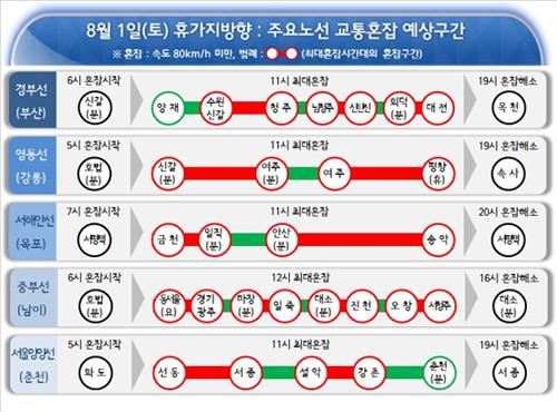 경부선은 오전 11시께 수원 신갈∼청주, 영동선도 같은 시각 여주∼평창휴게소 구간이 가장 혼잡할 것으로 예상된다.