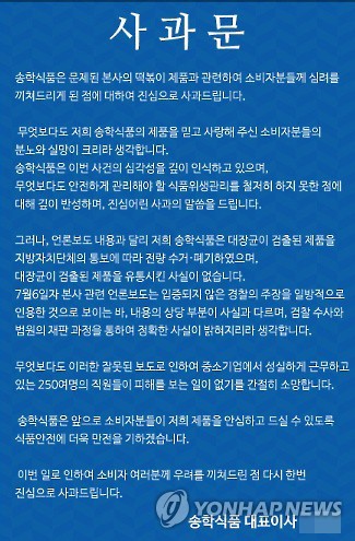 당시 송학식품은 사과문에서 "대장균이 검출된 제품을 지자체의 통보에 따라 전량 거둬들여 폐기했다"며 "대장균이 검출된 제품을 유통한 사실이 없다"고 밝혔다.