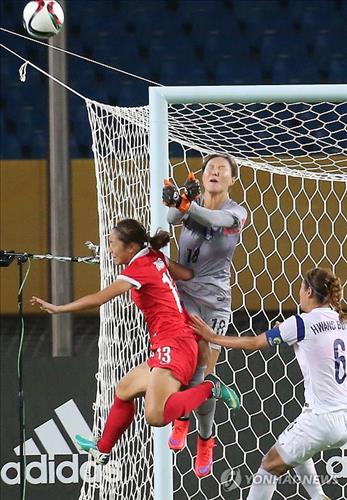 (우한=연합뉴스) 김태종 기자 = 한국 여자축구의 맏언니 골키퍼 김정미(인천현대제철)가 2015 동아시아축구연맹(EAFF) 축구선수권대회(이하 동아시안컵) 중국과의 첫 경기에서 또 한번의 '슈퍼세이브'로 첫 승을 안겼다.