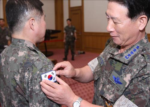 (서울=연합뉴스) 김귀근 기자 = 공군본부는 3일 최차규 참모총장 주관으로 장병 군복에 태극기 마크 달기 행사를 했다고 밝혔다.