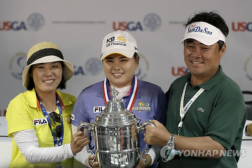 | △ 엄마ㆍ아빠와 함께 우승 트로피를 US여자오픈에서 메이저대회 3연승 대기록을 달성하고 아버지 박건규, 어머니 김성자씨와 트로피를 들고 포즈 취하는 박인비 (AP=연합뉴스 DB) |
