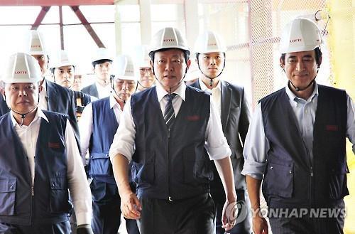 △ (서울=연합뉴스) 신동빈 롯데그룹 회장이 3일 오후 서울 송파구 제2롯데월드 공사 현장을 방문해 현장 상황을 점검하고 있다. 2015.8.3 << 롯데그룹 제공 >>