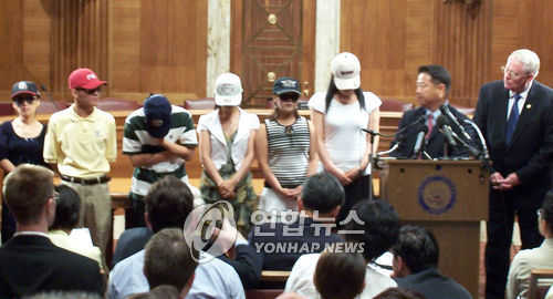 △ 2006년 미국에 망명한 탈북자 6명이 의회에서 기자 회견을 열고 북한의 인권실태와 탈북자 문제에 대해 증언하고 있다. (연합뉴스 자료사진)