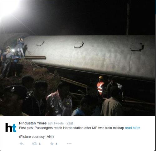 △ 4일 오후 11시30분께 인도 중부 마디아프라데시 주에서 열차 탈선 사고가 발생했다. 사진은 현지 일간 힌두스탄타임스가 트위터에 올린 탈선 현장 모습<<힌두스탄타임스 트위터캡처>>