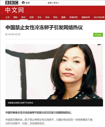 △ 중국의 유명 여배우 쉬징레이가 미혼 여성이 난자를 얼리지 못하는 중국법을 공개적으로 비판하면서 관련법을 둘러싸고 논란이 벌어지고 있다고 영국 BBC방송 중문망이 보도했다. 사진은 BBC중문망 보도 캡쳐. 2015.8.5 (서울=연합뉴스)