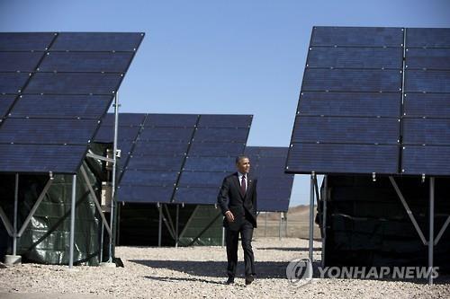 △ 버락 오바마 미국 대통령이 지난 4월 유타주 공군기지의 태양광 패널 사이를 걸어가고 있다.(AP=연합뉴스)