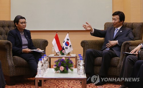 △ 대화하는 한-인도네시아 (쿠알라룸푸르=연합뉴스) 박동주 기자 = 윤병세 외교부 장관이 5일 말레이시아 쿠알라룸푸르 푸트라세계무역센터(PWTC)에서 열린 한-인도네시아 외교장관회담에서 레트노 마르수디 인도네시아 외무장관과 대화하고 있다.