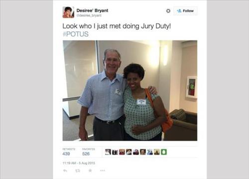 예비 배심원 셰리 콜먼 씨는 "부시 전 대통령은 '여보세요, 나는 여기 의무를 다하기 위해 왔소'라고 호탕하게 웃었다"면서 "그는 매우 매력적이고 다정다감한 좋은 사람(Nice Guy)"이라고 했다.