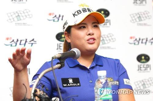 | △ (제주=연합뉴스) 변지철 기자 = 커리어 그랜드슬램을 달성한 '골프여제' 박인비(KB금융그룹)가 KLPGA 투어 제주 삼다수 마스터스 대회를 하루 앞둔 6일 오후 제주 오라 컨트리클럽에서 취재진의 질문에 답하고 있다. 2015.8.6 bjc@yna.co.kr |