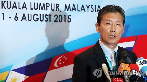 | △ 북한, ARF서 기자회견 (쿠알라룸푸르=연합뉴스) 박동주 기자 = 북한 리동일 외무성 대변인이 6일 말레이시아 쿠알라룸푸르 푸트라세계무역센터(PWTC)에서 기자회견을 하고 있다. |