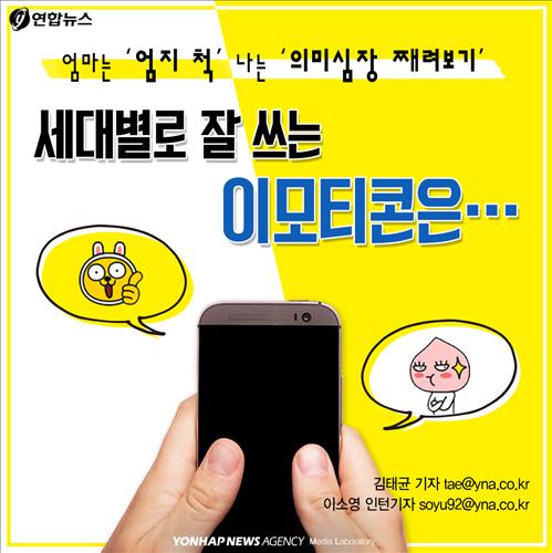 (서울=연합뉴스) 김태균 기자·이소영 인턴기자 = 스마트폰 대화의 '감초' 이모티콘. 각 세대가 선호하는 이모티콘이 같을 순 없겠죠. 20대와 장년층의 '완소' 이모티콘을 살펴본 연구결과가 나왔습니다.