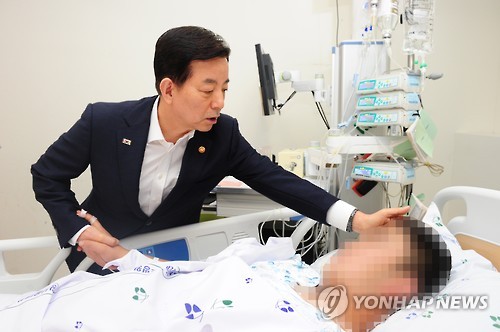 △ 한민구 장관, DMZ 폭발사고로 다쳐 치료받는 부사관 위문 (서울=연합뉴스) 한민구 국방부 장관이 7일 경기도 성남시 분당서울대학교병원을 방문, 지난 4일 경기도 파주 인근 DMZ에서 수색작전 중 폭발물이 터져 부상한 하모 하사를 위문하고 있다. (국방부 제공)