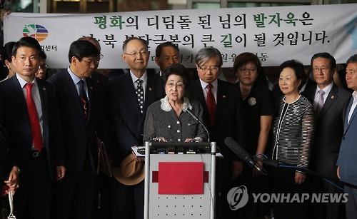 △ 방북 소감 밝히는 이희호 여사 (서울=연합뉴스) 이정훈 기자 = 3박 4일간의 방북 일정을 마친 이희호 여사가 8일 오후 김포공항을 통해 귀국, 방북 소감을 밝히고 있다. 2015.8.8 uwg806@yna.co.kr