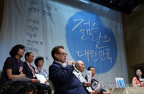 △ '젊은 날의 대한민국' 출판기념 북콘서트 (서울=연합뉴스) 이지은 기자 = 9일 오후 서울 마포구 가톨릭청년회관에서 열린 '젊은 날의 대한민국' 출판기념 북콘서트에서 파독 광부·간호사, 한국과학기술연구원(KIST) 창립멤버 등이 토크 형식으로 청년들에게 전하고 싶은 메시지를 말하고 있다. 이 책은 14명의 대학생 집필단이 60~70년대 당시 청년들의 이야기를 인터뷰 형식으로 담아 엮었다. 2015.8.9 jieunlee@yna.co.kr