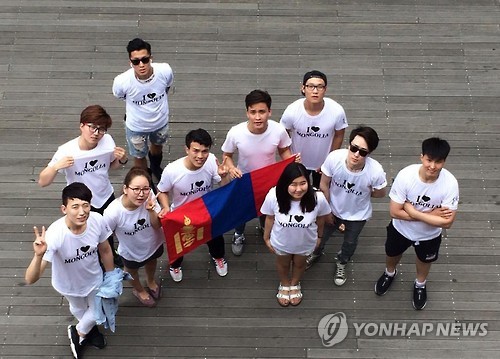 | △ 'I♥MONGOLIA' 모국에 기부한 광운대 몽골 유학생들 (서울=연합뉴스) 지난 6월 광운대 몽골학생회는 몽골 울란촐로트 쓰레기마을 아이들에게 농구장을 지어주는 프로젝트에 참여했다. 티셔츠를 구매해 모은 성금을 전달했다. 사진 앞줄 맨 왼쪽이 삼보 볼간타미르. 2015.8.9 << 렛츠코몽 제공 >> photo@yna.co.kr |