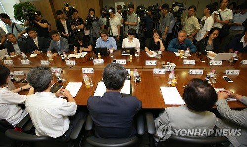 | △ 삼성 백혈병 조정안 발표하는 김지형 위원장 (서울=연합뉴스) 임헌정 기자 = 23일 오후 서울 서대문구 법무법인 지평 회의실에서 열린 삼성전자 반도체 공장 근로자 직업병 보상 등에 대한 조정안 발표에서 김지형 조정위원장(아래쪽 가운데)이 조정안을 발표하고 있다. 2015.7.23 kane@yna.co.kr |