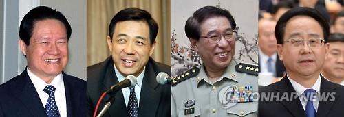 | △ 저우융캉 전 정치국 상무위원(무기징역, 왼쪽), 보시라이 전 충칭시 당서기(무기징역, 왼쪽두번째), 쉬차이허우 전 중앙군사위 부주석(사망, 왼쪽세번째), 링지화 전 통일전선공작부장(사법처리 진행 중). 시진핑 체제들어 몰락한 고위인사들로 중국의 '신4인방'으로 불린다. (연합뉴스 자료사진) |