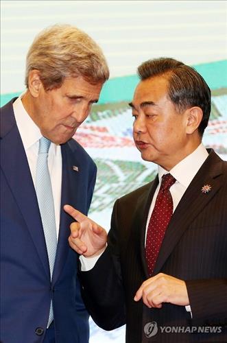 | △ 존 케리 미국 국무장관과 왕이(王毅) 중국 외교부장이 지난 6일 말레이시아 쿠알라룸푸르 푸트라세계무역센터(PWTC)에서 열린 EAS(동아시아정상회의) 외교장관회의에서 대화를 나누고 있다.(연합뉴스 자료사진) |
