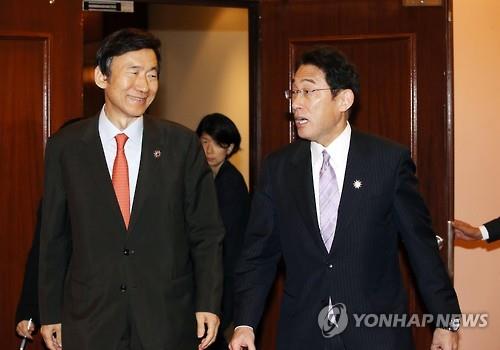 △ 윤병세 외교부 장관(왼쪽)과 기시다 후미오(岸田文雄) 일본 외무상이 6일 말레이시아 쿠알라룸푸르 푸트라세계무역센터(PWTC)에서 약식 회담을 마친 후 회의장을 나서는 모습.