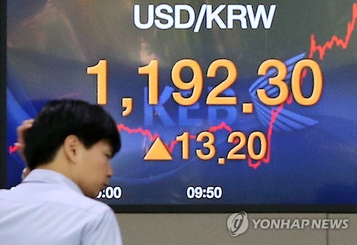 (서울=연합뉴스) 김수현 기자 = 중국의 위안화 추가 평가절하 영향으로 원/달러 환율이 이틀째 급등해 장중 1,190원대로 올라섰다.