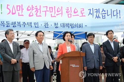 △ (서울=연합뉴스) 김수영 양천구청장이 23일 오후 목동행복주택 비상대책위원회 사무실 앞에서 열린 '목동행복주택 지구지정취소 기자설명회'에서 국토교통부의 결정을 환영한다는 내용의 모두발언을 하고 있다. 2015.7.23 << 양천구청 제공 >> photo@yna.co.kr (끝)