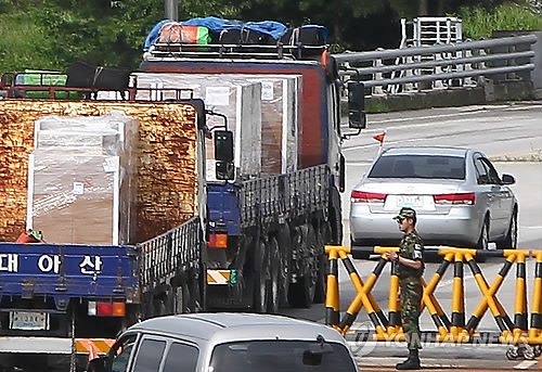 | △ 지난 2011년 경기도 파주시 통일대교에서 말라리아 남북공동 방역사업 2차 물자가 남북출입사무소를 통과해 북으로 가고 있다. (연합뉴스 자료사진) |