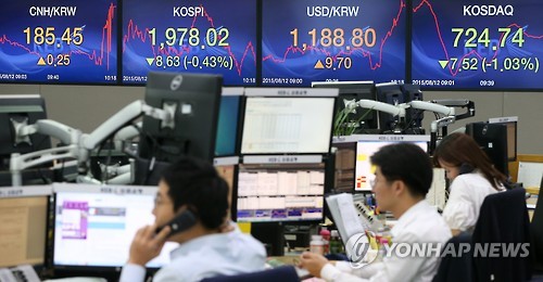 △ 위안화 평가절하 여진…코스피 약보합 (서울=연합뉴스) 한종찬 기자 = 코스피가 12일 중국 위안화 평가절하의 여파가 이어지며 약보합 흐름을 나타냈다. 코스피는 이날 오전 10시 전날보다 5.08포인트(0.26%) 하락한 1,981.57을 나타냈다. 지수는 6.61포인트(0.33%) 하락한 1,980.04로 개장하고 나서 소폭의 등락을 거듭 중이다. 전날 중국 인민은행의 기습적인 위안화 평가절하로 세계 금융시장이 출렁이면서 한국 증시에 이틀째 후폭풍이 미치는 모습이다. 코스닥지수는 전 거래일보다 6.95포인트(0.95%) 하락한 725.31을 나타냈다. 코스닥지수는 2.02포인트(0.28%) 하락한 730.24로 출발하고 나서 낙폭이 확대됐다. 사진은 이날 오전 서울 중구 외환은행 본점 딜링룸. 2015.8.12 saba@yna.co.kr