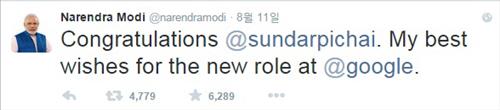 인도 태생 피차이 구글 CEO에 모디 총리도 '트위터 축하'