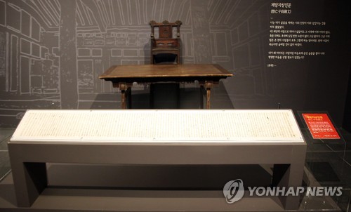 | △ 독립투사 부친의 애끓는 고백 (울산=연합뉴스) 허광무 기자 = 고헌 박상진(1884∼1921) 의사의 아버지 박시규옹이 1923년 형무소에서 처형된 아들의 2주기를 맞아 쓴 제문 '제망자상진문(祭亡子尙鎭文)'. 아들에 대한 자랑스러움, 그리움과 원망, 가족이 처한 현실 등이 절절이 담겨 있다. 이 제문은 광복 70주년 기념 특별기획전 '광복, 다시 찾은 빛'이 열리는 울산박물관에 전시돼 있다. 2015.8.13 hkm@yna.co.kr |