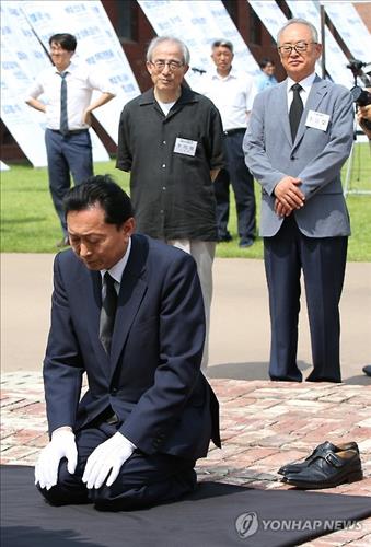 | △ 12일 오후 한국을 찾은 하토야마 유키오(鳩山由紀夫) 전 일본 총리가 서울 서대문형무소를 방문, 추모비 앞에서 무릎을 꿇고 있다.(연합뉴스 자료사진) |