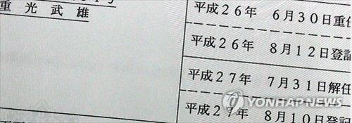 | △ L투자회사의 법인 등기부 등본에서 신격호(일본명 시게미쓰 다케오<重光武雄>·93) 총괄 회장이 지난달 31일 자로 해임됐다고 기재된 부분. 2015.8.13 |