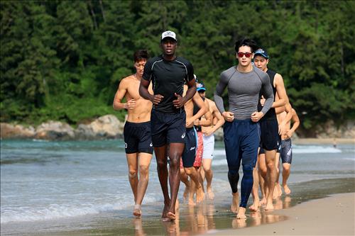 | △ (서울=연합뉴스) 오레올(왼쪽), 문성민 등 현대캐피탈 선수들이 13일 남해 송정솔바람해변에서 체력 훈련을 하고 있다. <<현대캐피탈 제공>> |