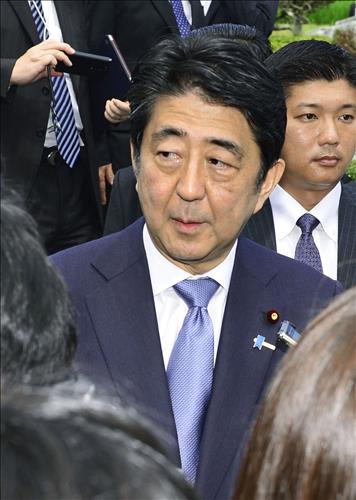 | △ 14일 자신의 정치적 고향인 야마구치현에 있는 부친의 묘에 참배한 뒤 기자들과 만난 아베 총리(교도.연합뉴스) |
