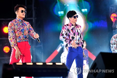 | △ 멋진 무대 선보이는 유재석과 박진영 (평창=연합뉴스) 13일 오후 강원도 평창 알펜시아 스키 점프대 앞 광장에서 열린 '2015 무한도전 영동고속도로 가요제'에서 개그맨 유재석과 가수 박진영이 멋진 무대를 선보이고 있다. ( MBC 제공 ) |