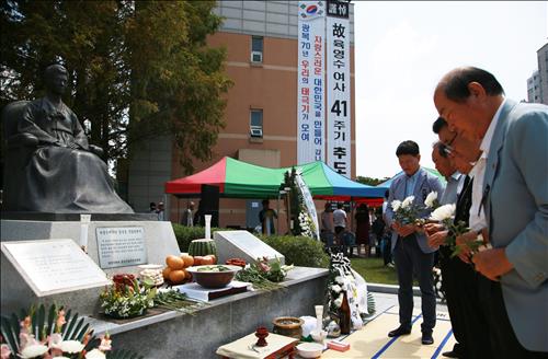 시민단체인 옥천군애향회가 옥천여성회관 광장에 세워진 육 여사 동상 앞에서 마련한 추모식에는 육씨 종친과 시민 300여명이 참석해 헌화·분향했다.