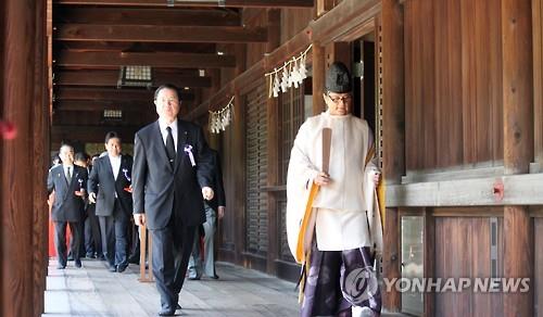 | △ '다함께 야스쿠니신사를 참배하는 국회의원 모임'(이하 모임)에 속한 일본 국회의원이 15일 오전 일본 도쿄도(東京都) 지요다(千代田)구 소재 야스쿠니(靖國)신사를 단체로 참배한 후 퇴장하고 있다. |