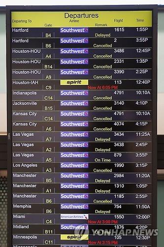 △ 지난 15일 미국 메릴랜드 주 볼티모어 워싱턴 국제공항의 한 전광판에 대부분의 항공기가 결항 또는 지연됐음이 표시된 모습.