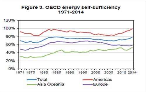 생산량이 소비량을 상회하면서 OECD 국가들의 에너지 자급률은 지난해 78%로 상승했다. 특히 셰일에너지 개발로 미국과 캐나다 등 북미 지역의 자급률은 사상 최고치인 99%까지 치솟았다.
