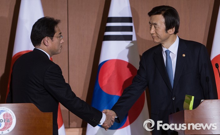 영국 BBC 방송은 1965년 이후 위안부 문제에 대한 최초 합의라며 위안부 문제 합의 소식을 주요 뉴스로 보도했다.(서울=포커스뉴스) 윤병세 외교부장관(왼쪽)과 기시다 후미오 일본 외무상이 28일 오후 서울 종로구 외교부청사에서 한일 외교장관 회담을 갖고 공동기자회견을 마친 뒤 악수를 나누고 있다.2015.12.28 김흥구 기자