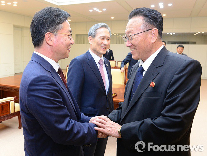 장의위원회 명단에 최룡해나 원동현 부부장 등 숙청설이 제기됐던 북측 인사들이 재등장한 것에 대해 정 대변인은 "현 시점에서는 추가적인 정보를 더 파악해야 될 필요가 있다고 생각한다"고 말했다.정부가 북한 김양건 노동당 비서 겸 통일전선부장의 사망에 대해 30일 홍용표 통일부 장관 명의로 조의를 표명했다. 사진은 지난 8월 25일 남북 고위급 접촉 타결 직후 손을 맞잡은 홍용표 통일부 장관과 북측 대표인 김 비서.2015.08.25<사진제공=통일부> 포커스포토