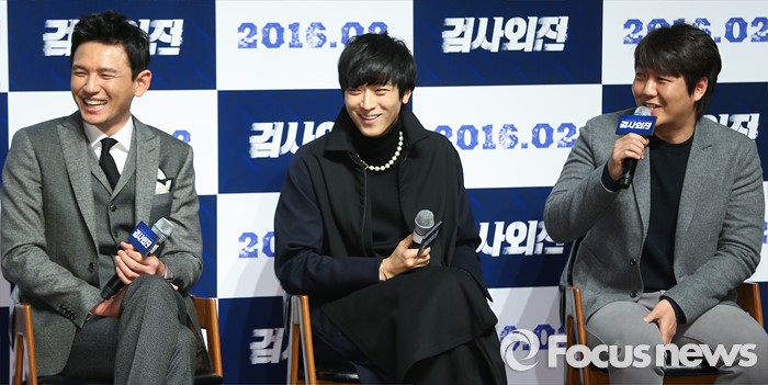 황정민과 강동원이 유쾌한 버디로 환상의 궁합을 예고했다. 다음 달 4일 개봉 예정이다.(서울=포커스뉴스) 4일 오후 서울 강남구 압구정 CGV에서 열린 영화 '검사외전' 제작보고회에 참석한 배우 황정민(왼쪽부터), 강동원과 이일형 감독이 환한 미소를 짓고 있다. 2016.01.04 김유근 기자
