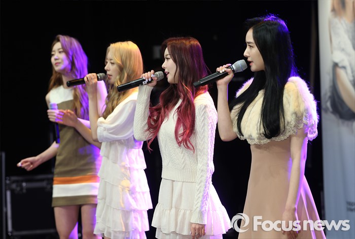 (서울=포커스뉴스) 5일 오후 서울 강남구 일지아트홀에서 열린 걸그룹 달샤벳의 9번째 미니앨범 'NATURALNESS' 발표 쇼케이스에 참석한 멤버 수빈(왼쪽부터), 아영, 세리, 우희가 신곡 '지긋이'의 무대를 선보이고 있다.