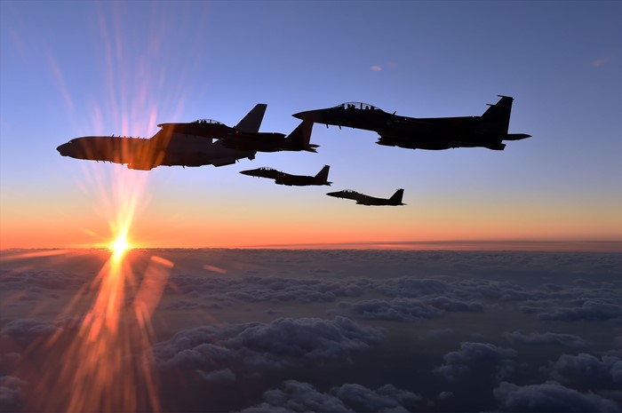 (서울=포커스뉴스) 공군 E-737 피스아이(선두)와 F-15K 편대가 대한민국의 동해안 호미곶 상공에서 일출을 맞이하고 있다. <사진제공=공군>