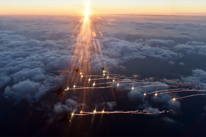 (서울=포커스뉴스) 공군 E-737 피스아이(선두)와 F-15K 편대가 2016년 새해 첫 해를 배경으로 플레어를 발사하며 기동하고 있다. <사진제공=공군>