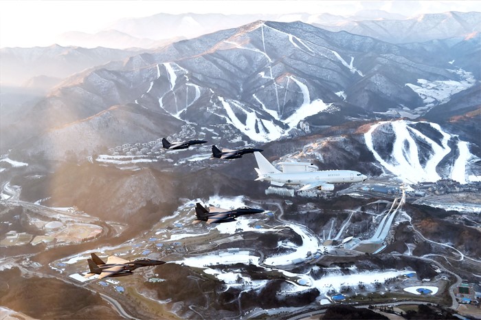 (서울=포커스뉴스) E-737 피스아이와 F-15K 편대가 2018년 동계 올림픽 개최 준비가 한창인 평창 알펜시아 스키장 상공을 비행하고 있다. <사진제공=공군>