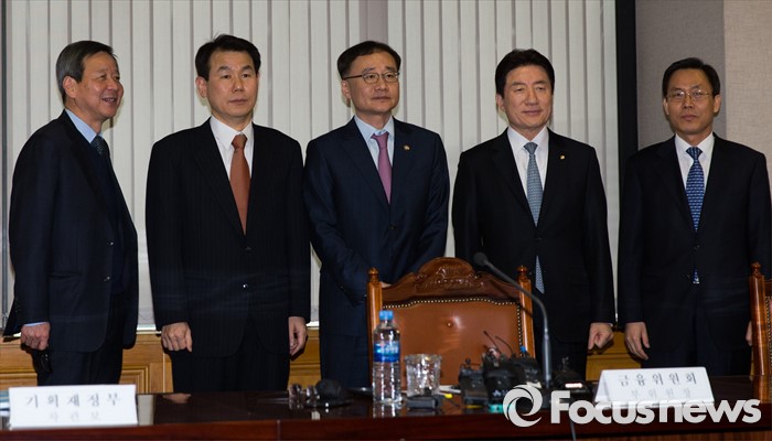 (서울=포커스뉴스) 북한이 수소탄 실험에 성공했다고 발표한 6일 오후 서울 중구 은행회관에서 열리는 긴급 거시경제금융회의에 앞서 참석자들이 취재진을 향해 포즈를 취하고 있다. 왼쪽부터 김익주 국제금융센터 원장, 정은보 기획재정부 차관보, 정찬우 금융위원회 부위원장, 장병화 한국은행 부총재, 서태종 금융감독원 수석부원장.